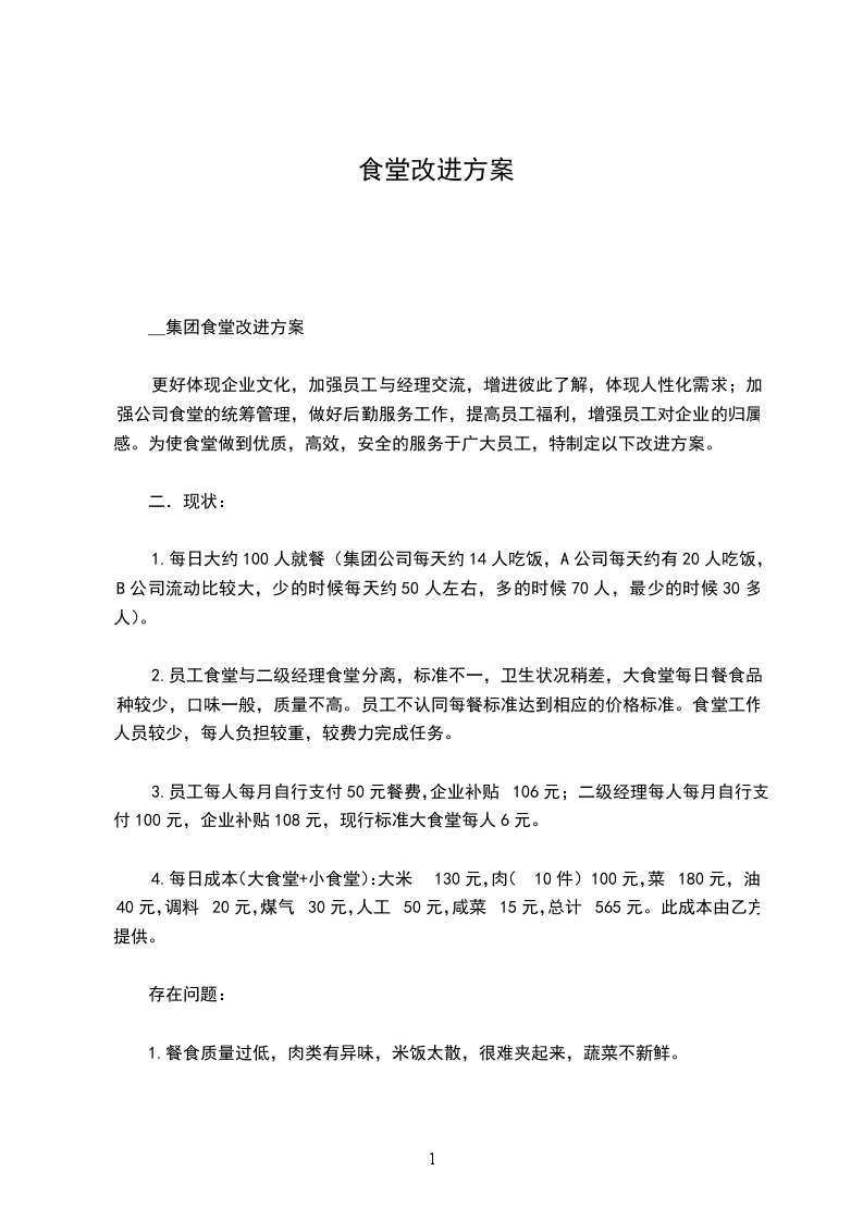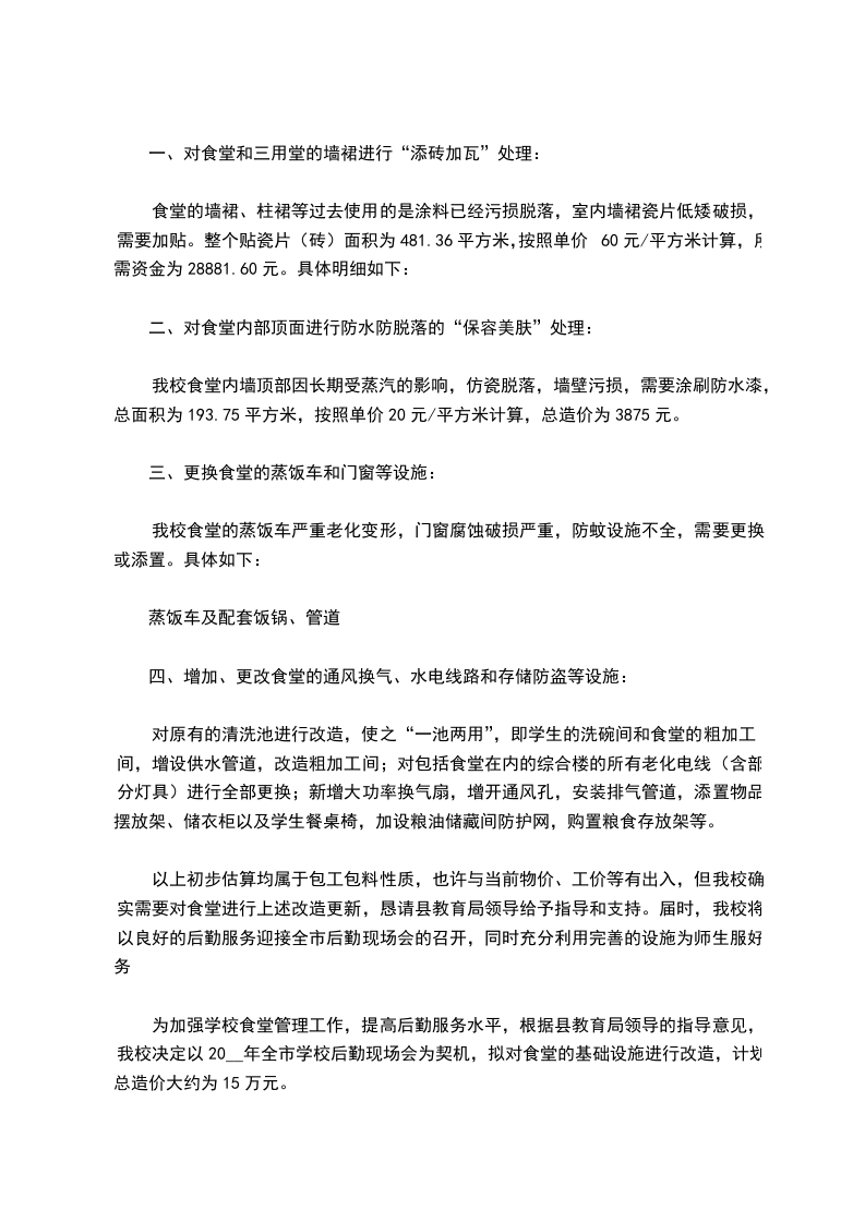 为加强学校食堂管理工作,提高后勤服务水平,根据县教育局领导的指导意见,我校决定以20__年全市学校后勤现场会为契机,拟对食堂的基础设施进行改造,计划总造价大约为15万元。