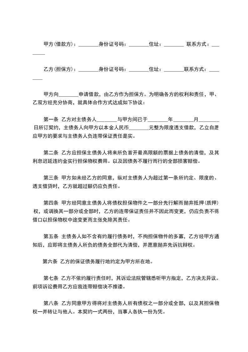 一、根据甲乙双方签订合同,甲方为乙方提供借款担保,借款金额大写:________(小写:________ )。甲方向乙方承诺的担保是用甲方资产为乙方作为信誉担保,而非抵押担保或质押担保。