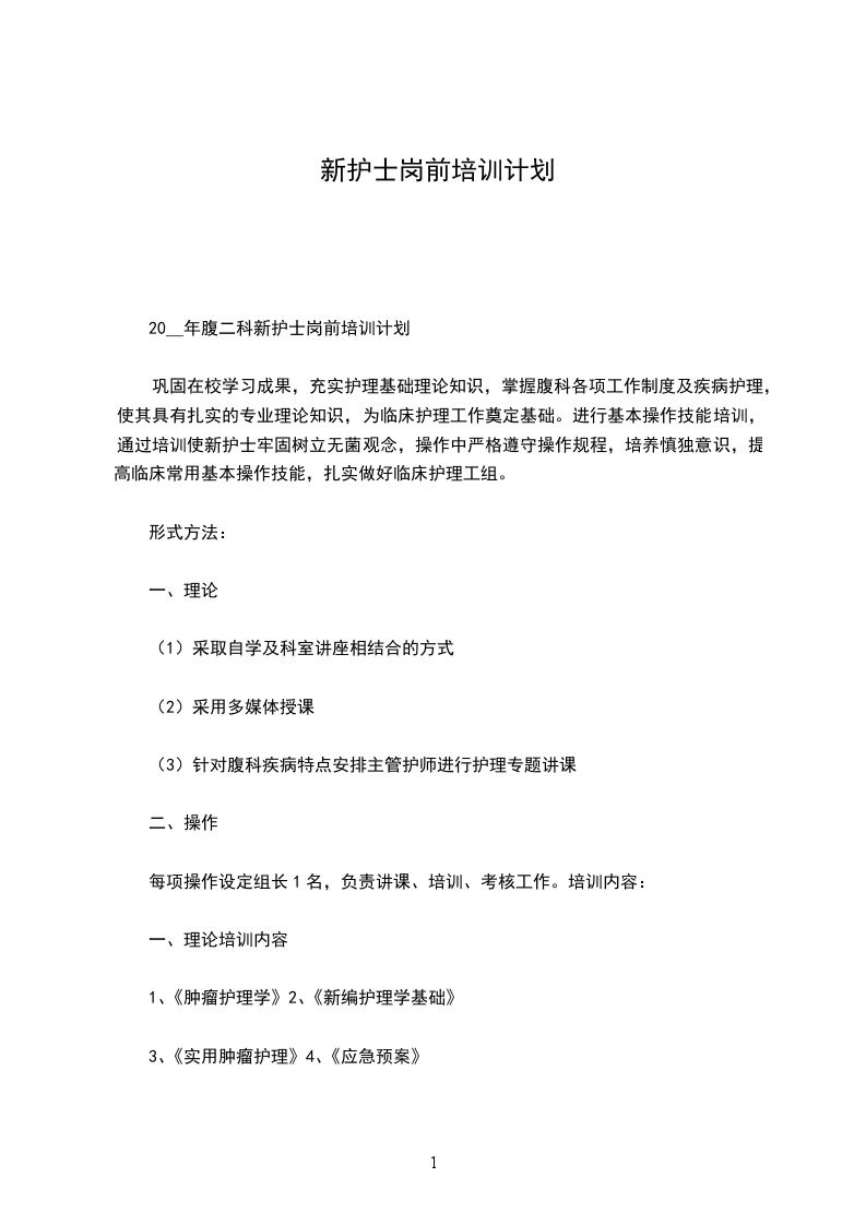 20__年腹二科新护士岗前培训计划
