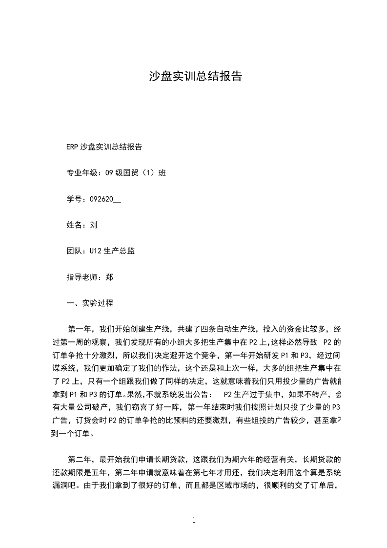 在这一轮实训中,因为我们是第一次接触ERP沙盘,所以对相关的操作和规则都不太熟悉,以致于我们组在第一轮实训中的表现不太理想。在操作过程中,我们组的组员分工明确,在遇到困难时积极请教老师,组员间互相讨论,力求取到做好方案。虽然这一轮实训的的成绩并不理想,但我们在这次的实训中,感受最深的还是团队合作的重要性。一个人无论你有多能干,始终不可能面面俱到,一个团队的领导者最重要的能力就是协调,协调并有效的利用资源,调动团队的积极性和队友的热情。可以说,一个成功的公司,内部必定有一个团结的,精明能干的团队。是这个团队使公司能够一步一步走向成功。