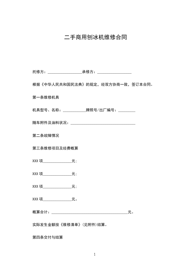 二手家用刨冰机销售合同