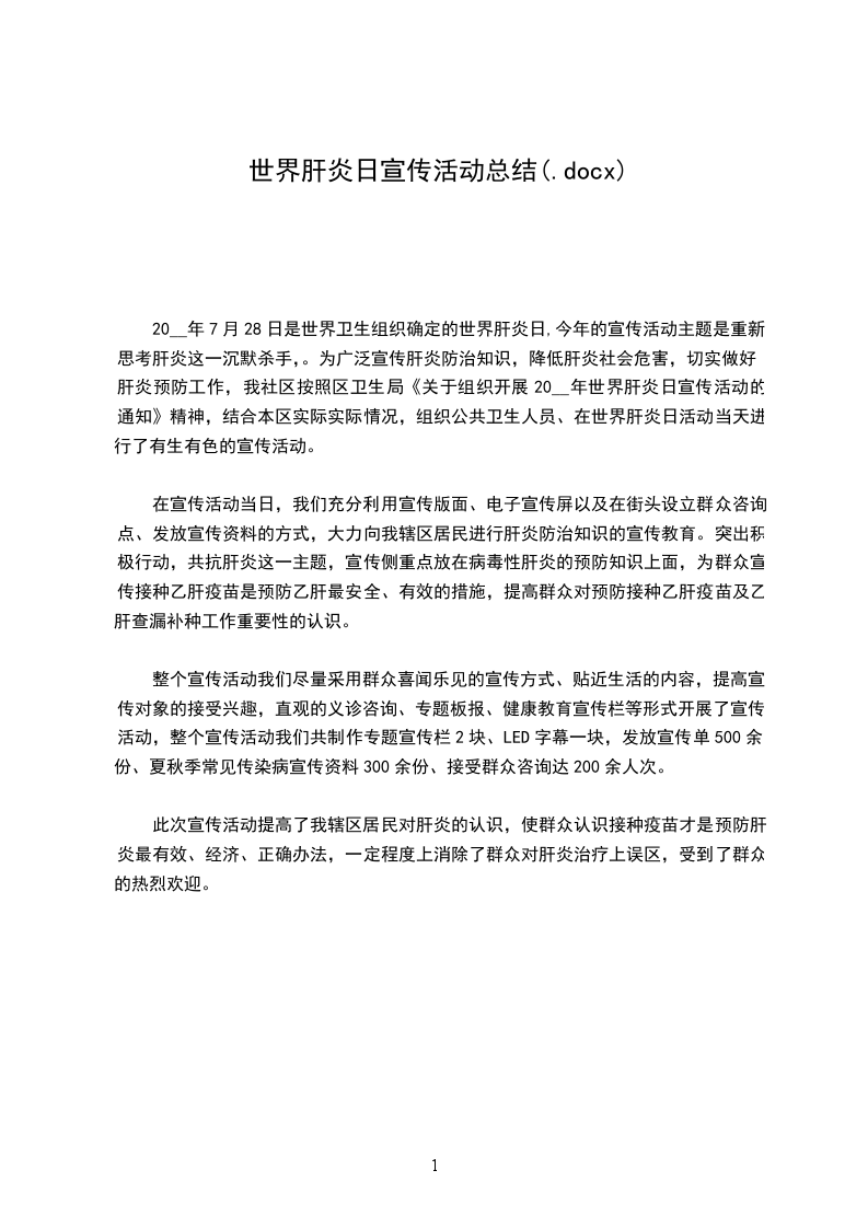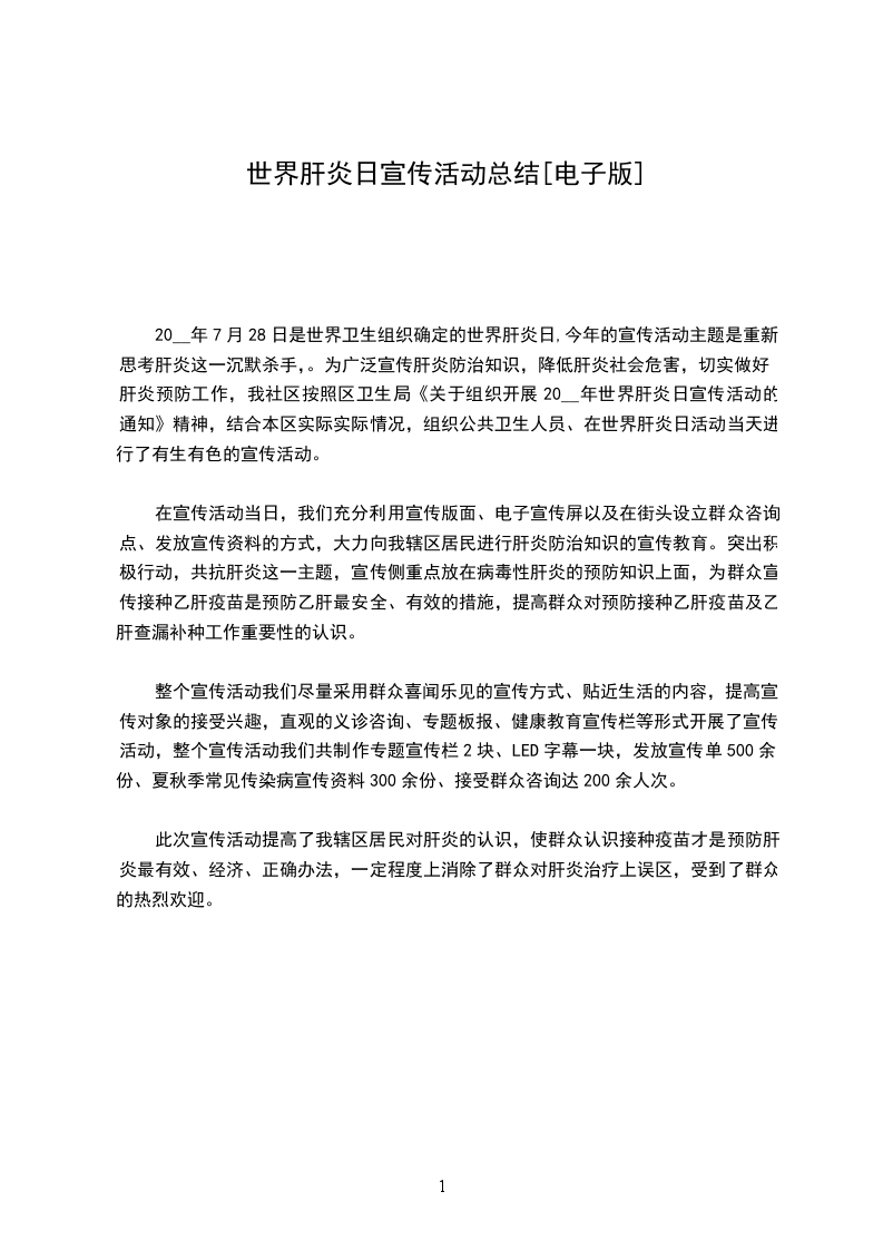 20__年7月28日是第4个“世界肝炎日”,今年我国“世界肝炎日”的的宣传主题:“战胜肝炎,从我做起”。为号召社会各界积极行动起来,关注肝炎防治工作,共同抗击肝炎,我乡决定于7月28日,开展一次宣传教育活动,为肝炎防控工作营造积极氛围,特制定本计划。