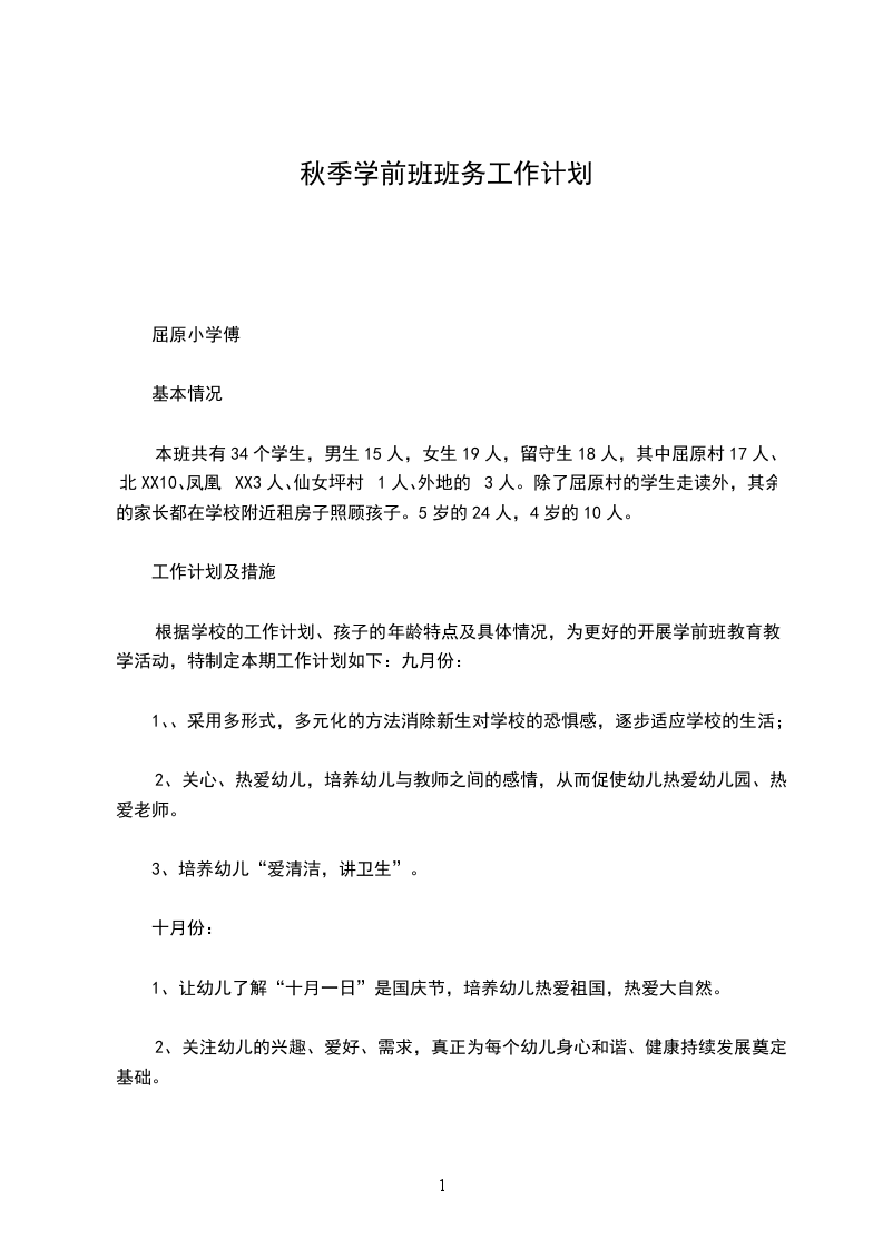 本班共有34个学生,男生15人,女生19人,留守生18人,其中屈原村17人、北XX10、凤凰XX3人、仙女坪村1人、外地的3人。除了屈原村的学生走读外,其余的家长都在学校附近租房子照顾孩子。5岁的24人,4岁的10人。
