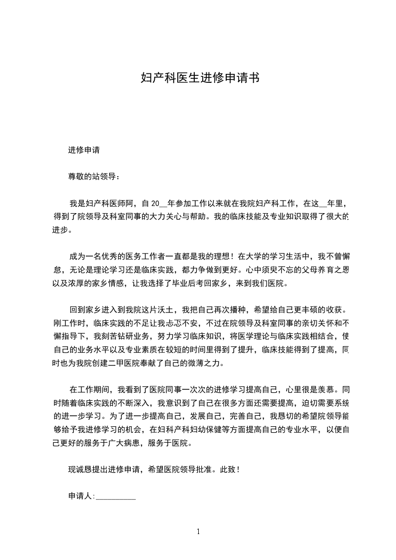 在工作期间,我看到了医院同事一次次的进修学习提高自己,心里很是羡慕。同时随着临床实践的不断深入,我意识到了自己在很多方面还需要提高,迫切需要系统的进一步学习。为了进一步提高自己,发展自己,完善自己,我恳切的希望院领导能够给予我进修学习的机会,在妇科产科妇幼保健等方面提高自己的专业水平,以便自己更好的服务于广大病患,服务于医院。