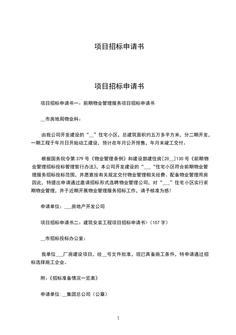 项目招标申请书一:前期物业管理服务项目招标申请书