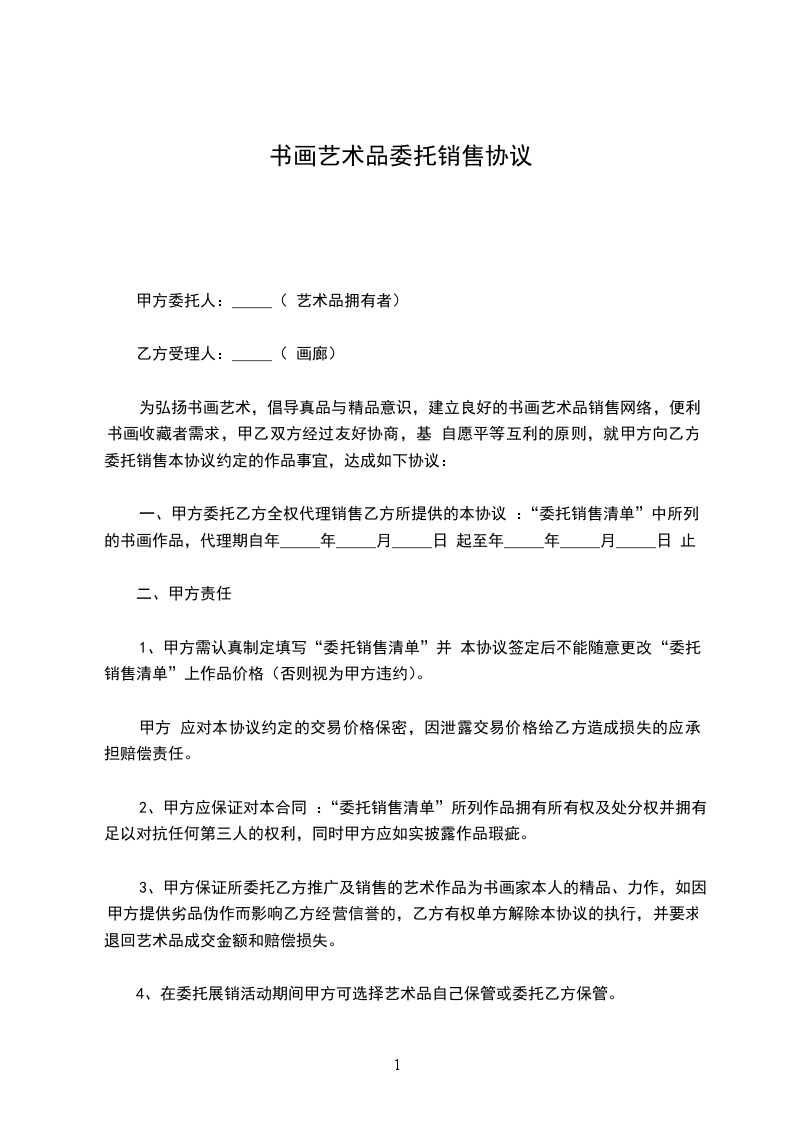 为弘扬书画艺术,倡导真品与精品意识,建立良好的书画艺术品销售网络,便利书画收藏者需求,甲乙双方经过友好协商,基 自愿平等互利的原则,就甲方向乙方委托销售本协议约定的作品事宜,达成如下协议: