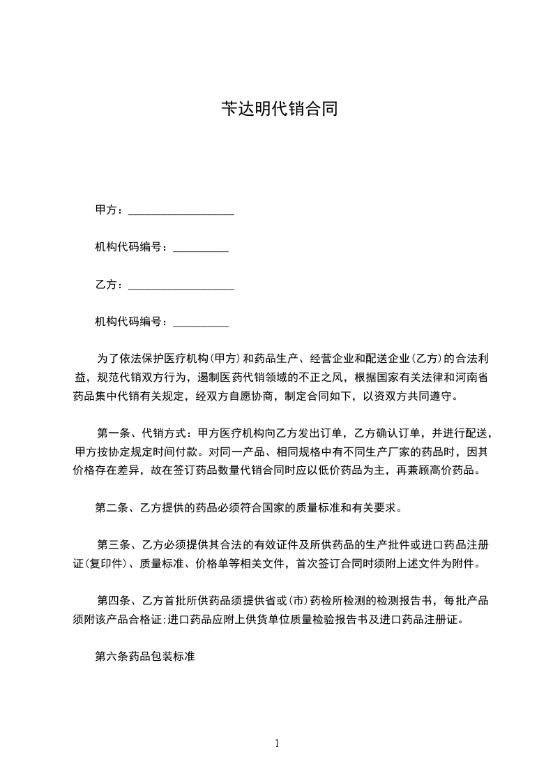 根据《中华人民共和国民法典》,甲、乙双方经协商确定,甲方向乙方代销药品。为明确双方责任和权利,特签订本合同,共同遵守。具体条款如下: