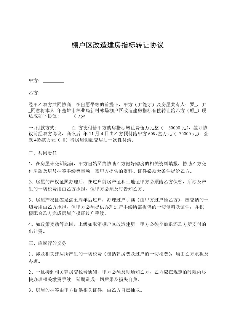 经甲乙双方共同协商,在自愿平等的前提下,甲方(尹能才)及房屋共有人:罗_,尹_同意将本人 年楚雄市林业局新村林场棚户区改造建房指标有偿转让给乙方(顾_)现达成如下协议:______< /p>
