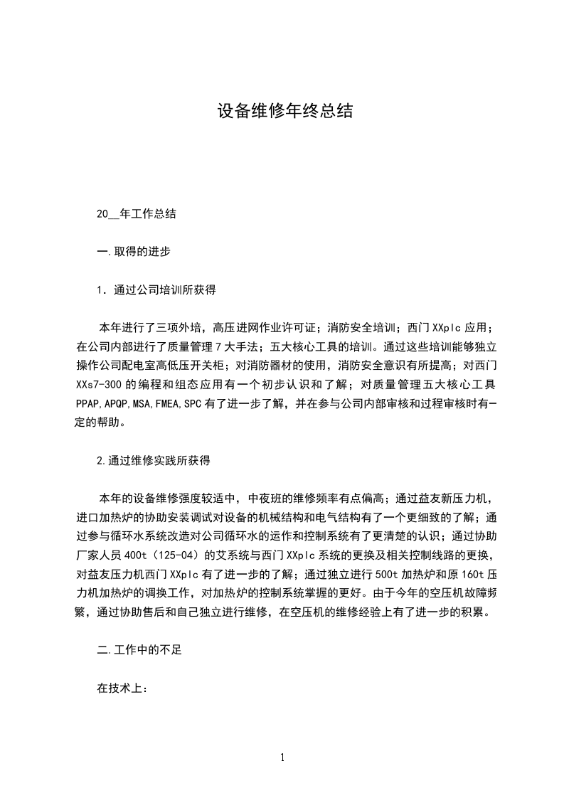 本年的设备维修强度较适中,中夜班的维修频率有点偏高;通过益友新压力机,进口加热炉的协助安装调试对设备的机械结构和电气结构有了一个更细致的了解;通过参与循环水系统改造对公司循环水的运作和控制系统有了更清楚的认识;通过协助厂家人员400t(125-04)的艾系统与西门XXplc系统的更换及相关控制线路的更换,对益友压力机西门XXplc有了进一步的了解;通过独立进行500t加热炉和原160t压力机加热炉的调换工作,对加热炉的控制系统掌握的更好。由于今年的空压机故障频繁,通过协助售后和自己独立进行维修,在空压机的维修经验上有了进一步的积累。