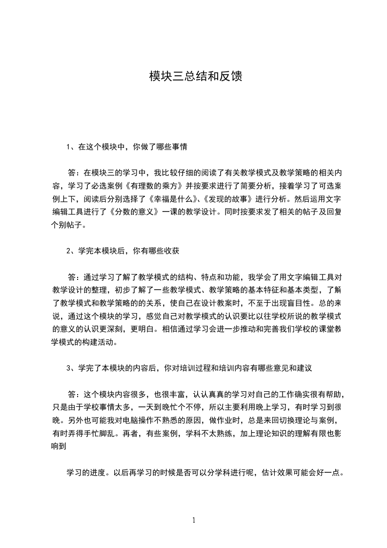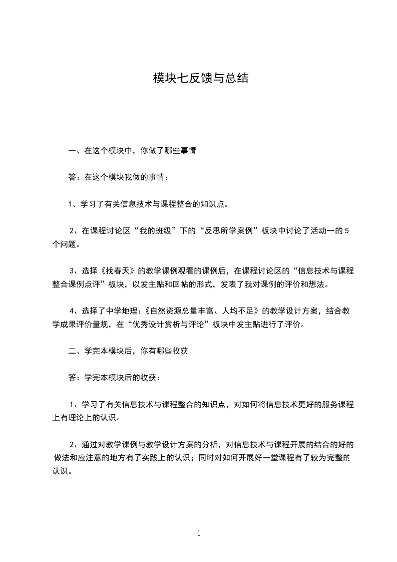 3.学完了本模块的内容之后,你对培训过程和培训内容有哪些意见和建议答:我认为本模块内容所体现的教学思想非常新颖,符合目前教育的时代要求。但要想发挥作用关键是落实,要想尽一切办法,创造一切条件运用到自己的教学实践之中。可是,在当前要具体落实却还是有些困难的,毕竟这一块还不熟练。所以,希望平台能够提供更多时间开展研究性学习的案例设计,促进教师的熟练应用,真正发挥其作用。
