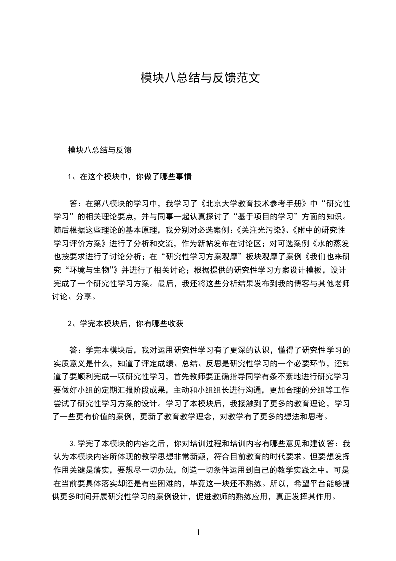 答:学完本模块后,我对运用研究性学习有了更深的认识,懂得了研究性学习的实质意义是什么,知道了评定成绩、总结、反思是研究性学习的一个必要环节,还知道了要顺利完成一项研究性学习,首先教师要正确指导同学有条不紊地进行研究学习,要做好小组的定期汇报阶段成果,主动和小组组长进行沟通,更加合理的分组等工作。尝试了研究性学习方案的设计。学习了本模块后,我接触到了更多的教育理论,学习了一些更有价值的案例,更新了教育教学理念,对教学有了更多的想法和思考。