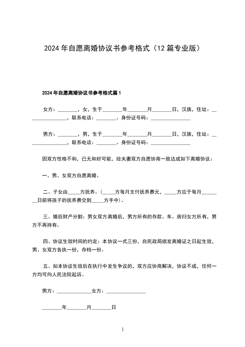 九、本协议一式________份,自婚姻登记处颁发离婚证之日起生效,男、女双方各执________份,婚姻登记机关存档一份。