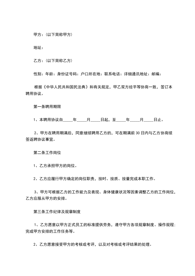 乙方:_____________________ ,年_____年_____月_____日 出生,身份证号码:_________ ,户籍地址:________________, 现居住地址:_________ 。因工作需要,甲方(以下简称甲方),聘用乙方(以下简称乙方)为本单位工作人员,双方自愿签定本合同,并遵守以下条款。
