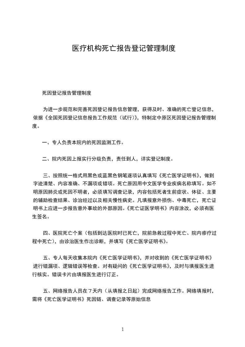 为进一步规范和完善死因登记报告信息管理,获得及时、准确的死亡登记信息,依据《全国死因登记信息报告工作规范(试行)》,特制定中原区死因登记报告管理制度。