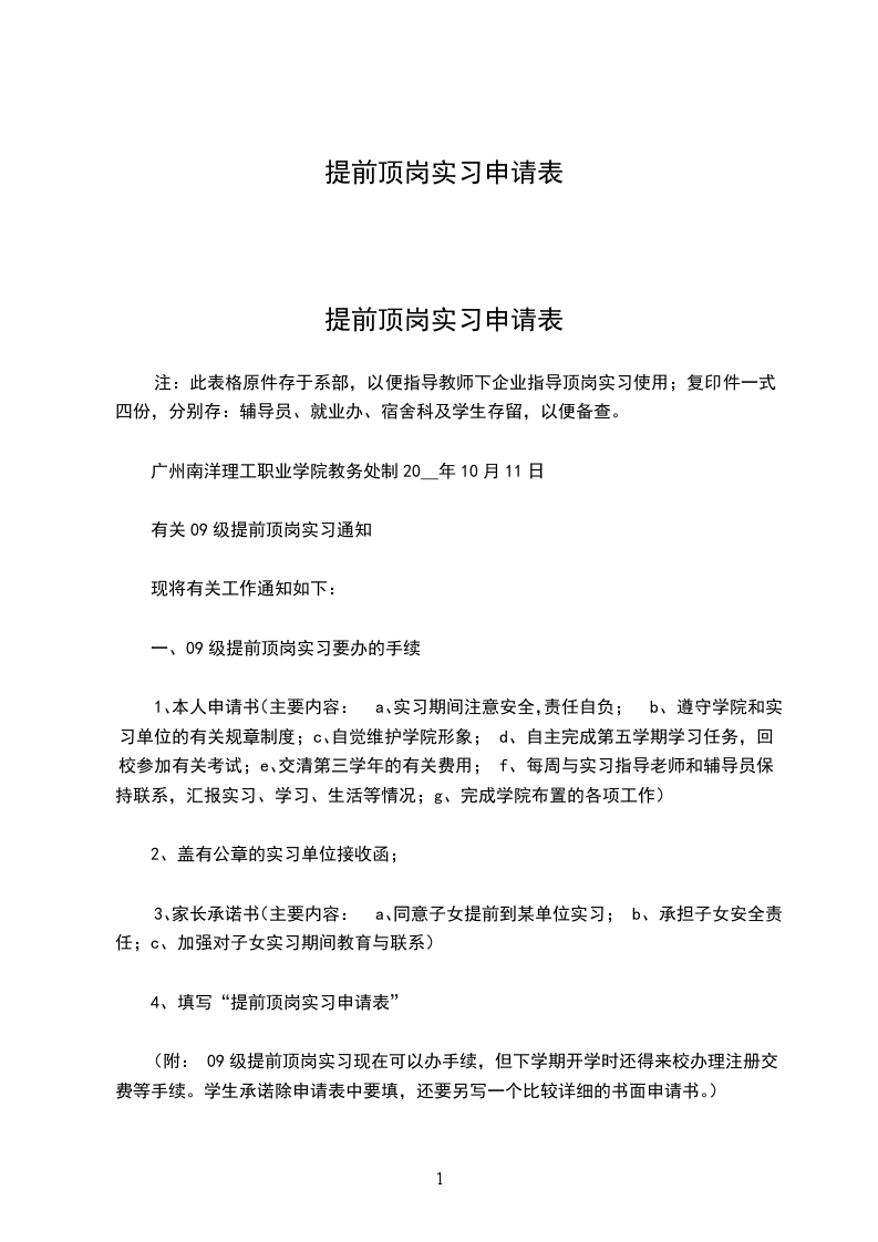 (附:09级提前顶岗实习现在可以办手续,但下学期开学时还得来校办理注册交费等手续。学生承诺除申请表中要填,还要另写一个比较详细的书面申请书。)
