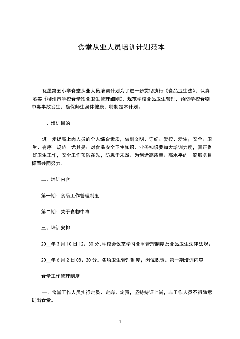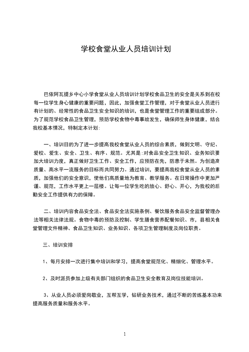 “民以食为天,食以安为先”。学校食品卫生的安全是关系到在校每一位师生身心健康的重要问题,因此,对于加强食堂工作管理,对于食堂从业人员进行有计划的、经常性的食品卫生安全知识的培训,也是食堂管理工作的重要组成部分。为了规范学校食品卫生管理,预防学校食物中毒事故发生,确保师生身体健康,特制定本计划: