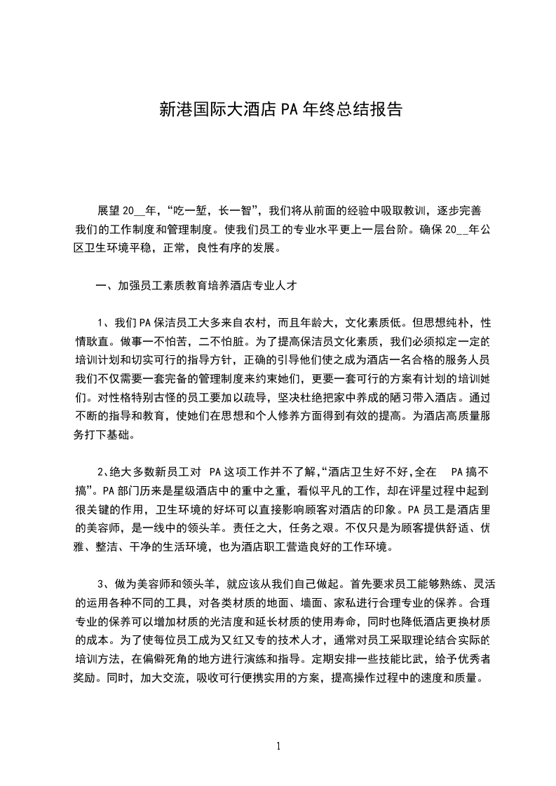 1、团结、求实、主动、负责、高效,这是我们20__年的行为标准。我们PA还有很多不足的地方,需要加强改进和完善。前期,酒店无主管且PA服务员人手也不足。在没有主管和人手的情况下,卫生状况非常不好。PA服务员做卫生欠缺技巧,甚至把在家中的一些陋习拿来酒店里操作。PA服务员也很懒散,没有主动面对工作的热情,漫无目的,不懂正常操作的程序,不懂各类药水的应用。
