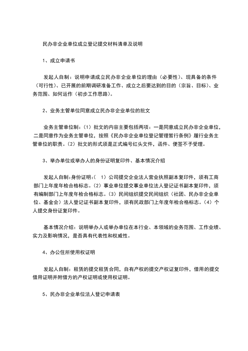 一、举办者的基本情况(是个人的写明姓名、性别、民族、身份证号码、常住户口所在地、现工作单位、政治面貌、是否具有完全民事行为能力等;是单位的则写明名称、性质、是否具有法人资格等)。二、法定代表人和负责人的基本情况(写明姓名、性别、民族、身份证号码、常住户口所在地、目前人事关系所在单位、政治面貌、是否具有完全民事行为能力、是否受过刑事处罚等)。三、已经有开办资金万元,资金的组成情况是,资金性质是(是国有或者非国有,二者比例)。四、办公和工作活动场所在〔社会大众都知道能够找到的具体地址〕,性质是(自有或者租用、借用)。五、申请登记的〔拟登记的民办非企业单位名称〕将要从事的业务活动属于行(事)业(教育、卫生、文化、体育、科技、劳动民政、法律服务或者其他),其性质是(必须载明是否是利用非国有资产、是否是自愿举办、是否是从事非营利性社会服务活动的社会组织),业务主管单位是。有名工作人员,其中有执业资格的执业人员有名。六、有规范的内部组织机构,其中权力机构是,执行机构是,内设机构有(已设置的所有内设机构名称)。七、已经制定了章程,章程符合民政部门的规范并经过