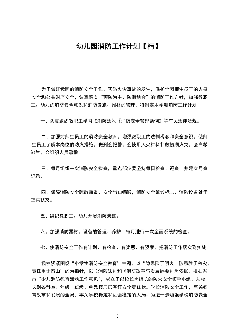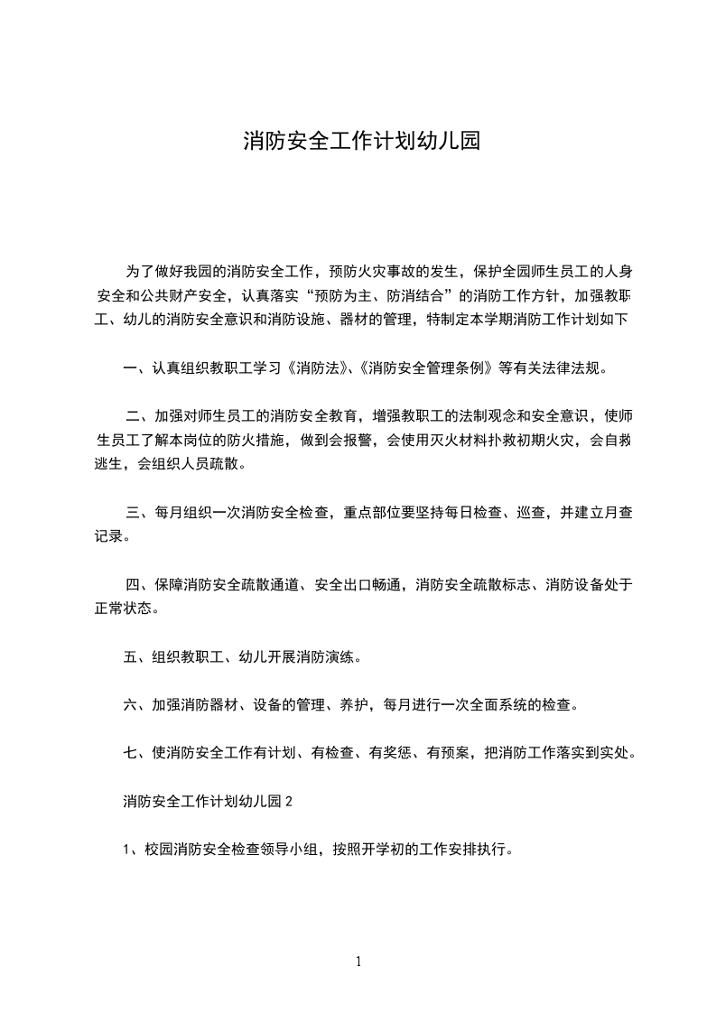 为了做好我园的消防安全工作,预防火灾的发生,保护师生员工的人身安全和公共财产安全,认真落实预防为主,防消结合的消防工作方针,加强教职工、幼儿的消防知识培训,消防设施、器材的管理,特制订工作计划如下: