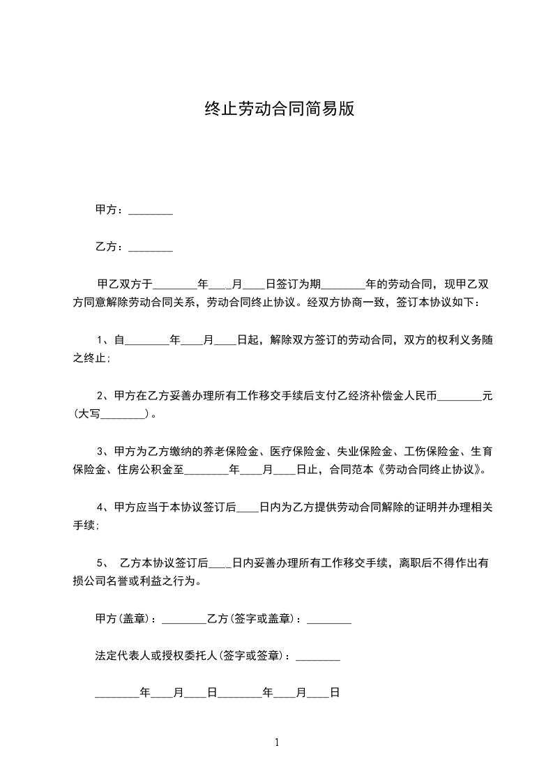 1、自________年____月____日起,解除双方签订的劳动合同,双方的权利义务随之终止;