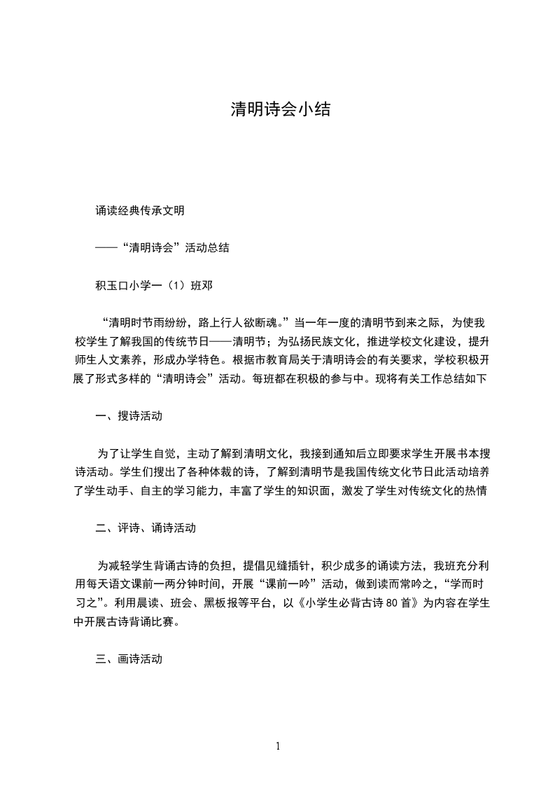 “清明时节雨纷纷,路上行人欲断魂。”当一年一度的清明节到来之际,为使我校学生了解我国的传统节日——清明节;为弘扬民族文化,推进学校文化建设,提升师生人文素养,形成办学特色。根据市教育局关于清明诗会的有关要求,学校积极开展了形式多样的“清明诗会”活动。每班都在积极的参与中。现将有关工作总结如下: