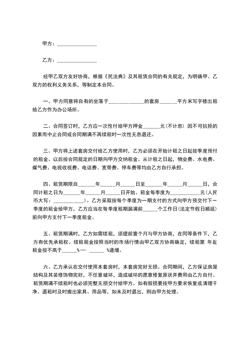 二.租赁用途:乙方租赁的该房屋仅用于办公,不得从事违反国家法律、法规的经营活动,不得擅自改变其用途。