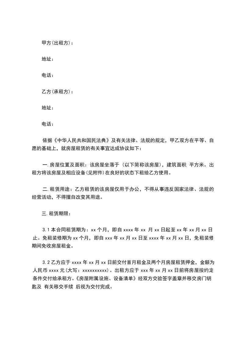 3.1本合同租赁期为:xx个月,即自xxxx年xx 月xx日起至xx年xx月xx日止。免租装修期为xx个月,即自xxx年xx月xx日至xxxx年xx月xx日,免租装修期间免收房屋租金。