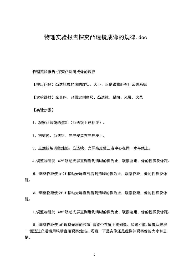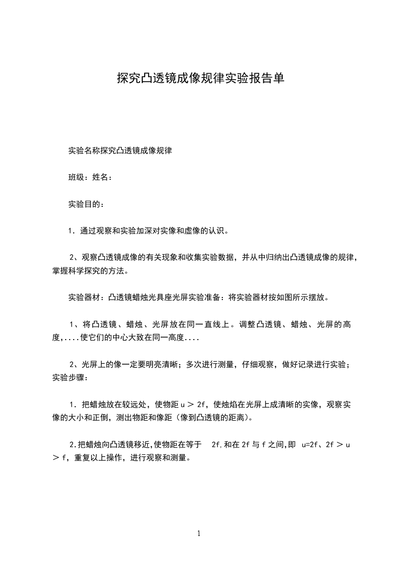 实验名称探究凸透镜成像规律
