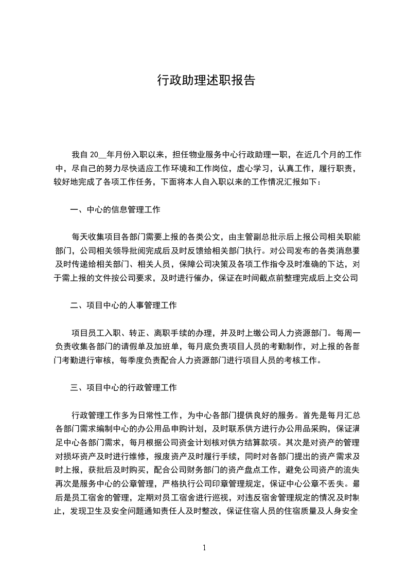 我自20__年月份入职以来,担任物业服务中心行政助理一职,在近几个月的工作中,尽自己的努力尽快适应工作环境和工作岗位,虚心学习,认真工作,履行职责,较好地完成了各项工作任务,下面将本人自入职以来的工作情况汇报如下: