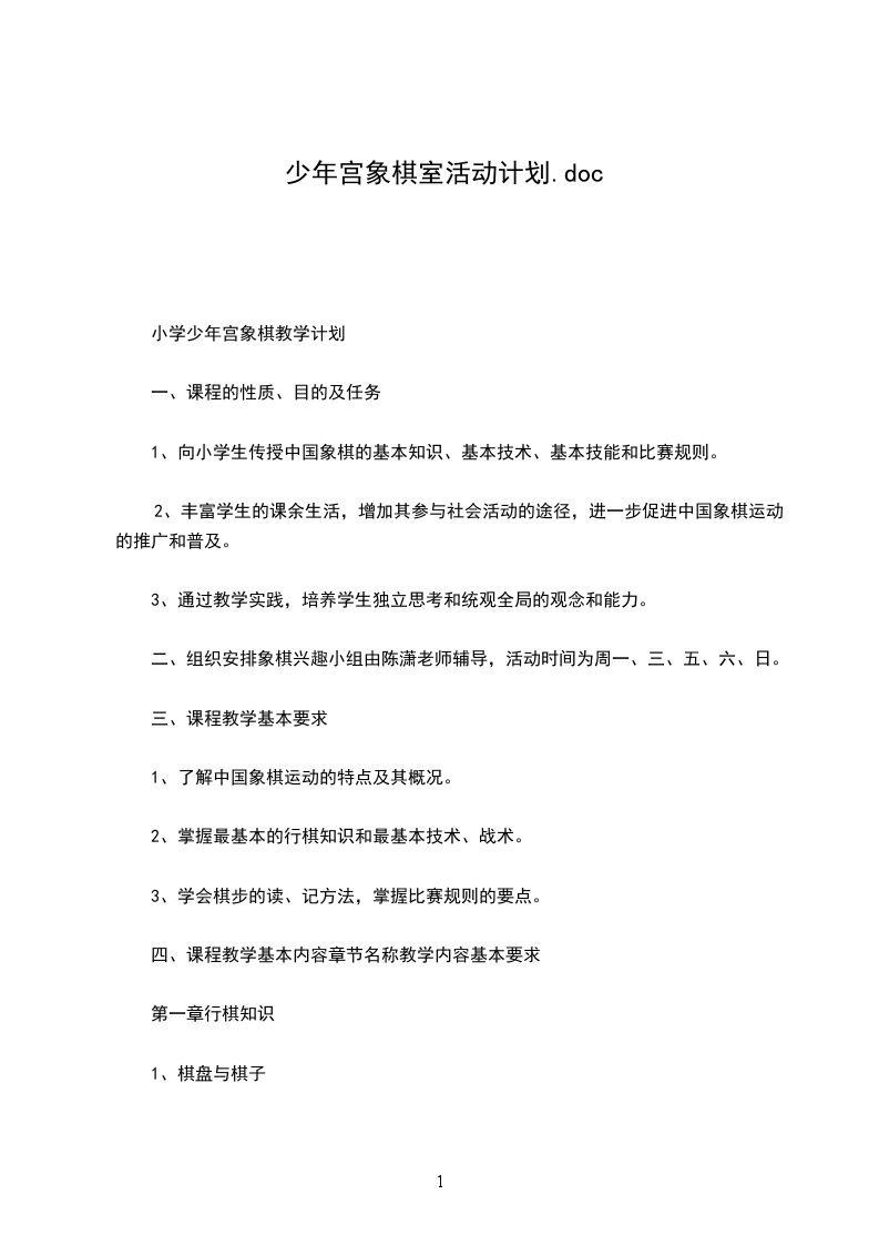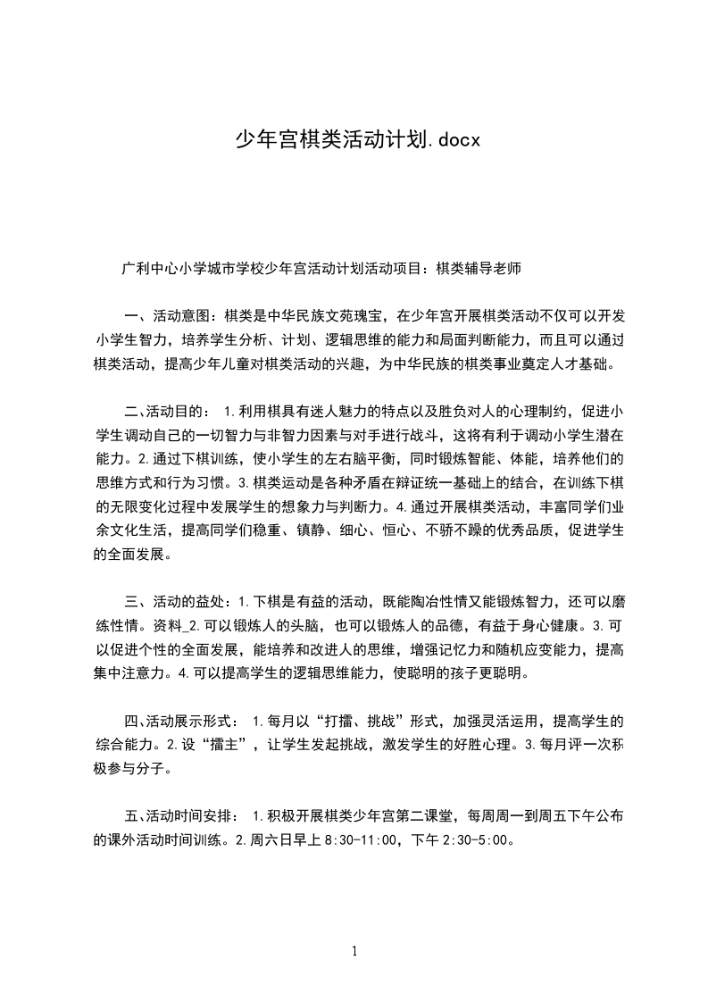 象棋是一项集益智、娱乐、德育为一体的综合性竞技活动。它对学生的思想品质、心理品质、智力发展和身体素质的影响是显而易见的。为了丰富学生的课余生活,发展学生的个性,使学生在感受棋带给他们快乐的同时,通过棋类获得自豪感和满足感,为了使少年宫活动在20__年度顺利举行,特制订如下计划: