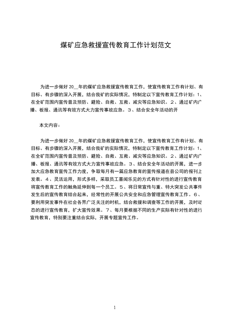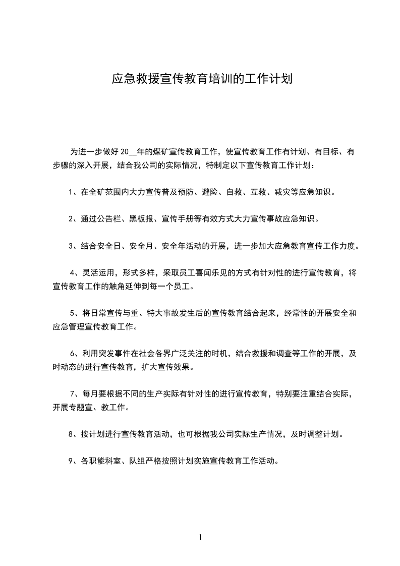 为进一步做好20__年的煤矿应急宣传教育工作,使宣传教育工作有计划、有目标、有步骤的深入开展,结合矿的实际情况,特制定以下宣传教育工作计划: