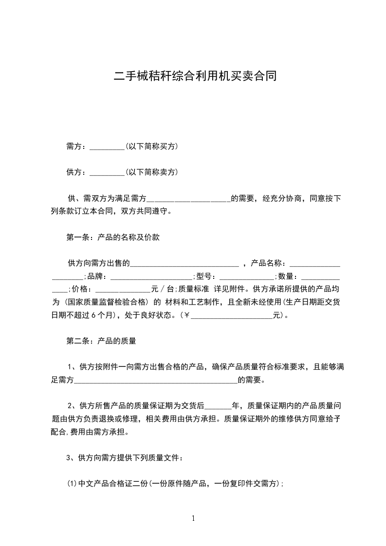 供方向需方出售的____________________________ ,产品名称:_____________________;品牌:_____________________;型号:______________;数量:______________;价格:______________元∕台;质量标准 详见附件。供方承诺所提供的产品均为 (国家质量监督检验合格) 的 材料和工艺制作,且全新未经使用(生产日期距交货日期不超过6个月),处于良好状态。(¥_____________________元)。