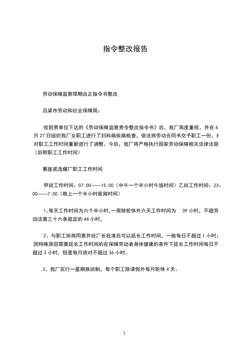 收到贵单位下达的《劳动保障监察责令整改指令书》后,我厂高度重视,并在6月27日组织我厂女职工进行了妇科病疾病检查,依法将劳动合同书交予职工一份,并对职工工作时间重新进行了调整。今后,我厂将严格执行国家劳动保障相关法律法规。(后附职工工作时间)