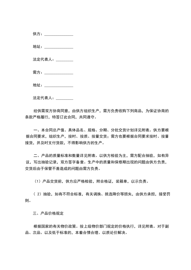经供需双方协商同意,由供方组织生产,需方负责收购下列商品,为保证协商的条款严格履行,特签订此合同,共同遵守。
