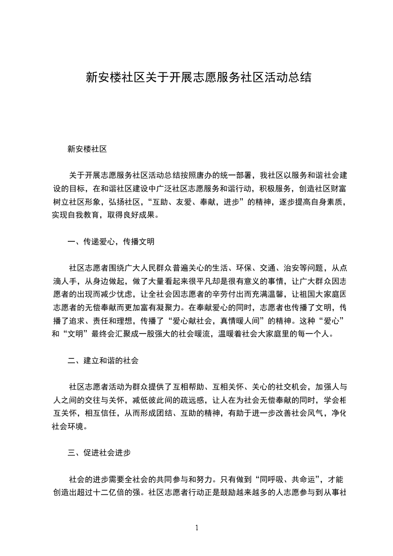关于开展志愿服务社区活动总结按照唐办的统一部署,我社区以服务和谐社会建设的目标,在和谐社区建设中广泛社区志愿服务和谐行动,积极服务,创造社区财富,树立社区形象,弘扬社区,“互助、友爱、奉献,进步”的精神,逐步提高自身素质,实现自我教育,取得良好成果。