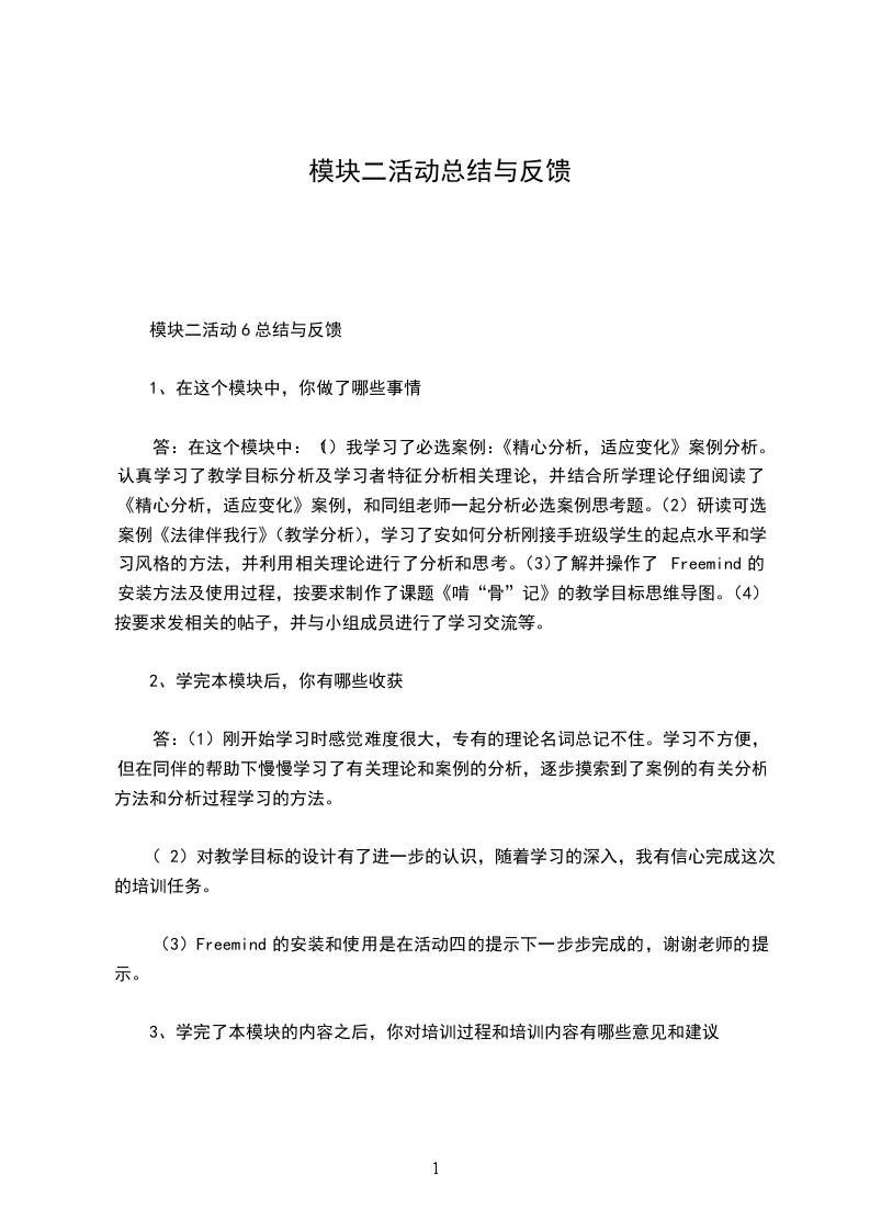 答:在这个模块中,我主要做了以下事情:一是,完成了模块二必选案例分析《精心分析,适应变化》,并在课程讨论区就必选案例的思考发贴提出自已的体会,并回贴与其他成员进行了交流。二选择了小学语文《在家里》、小学语文《自己去吧》两个案例,在课程讨论区发起两个主贴和大家交流。三是可选案例分析选择了案例B《啃“骨”记》进行了分析。四是应用可视化工具完成了小学语文《自己去吧》一节的教学目标分析图。五是对必选案例《精心分析,适应变化》中大家的讨论进行总结,并将小组讨论总结以新帖的形式发在小组讨论区中,作为小组成果展现给大家。