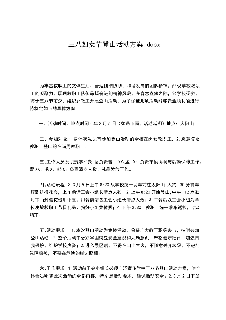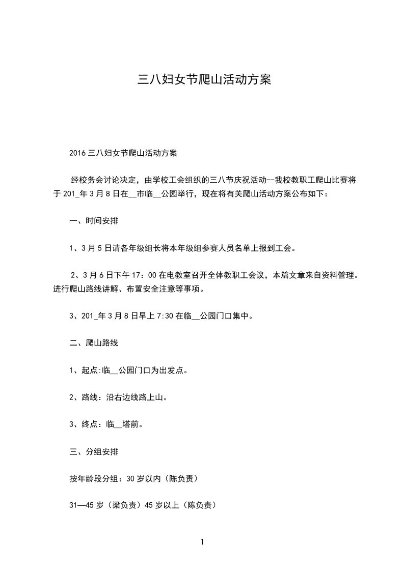 经校务会讨论决定,由学校工会组织的三八节庆祝活动--我校教职工爬山比赛将于201_年3月8日在__市临__公园举行,现在将有关爬山活动方案公布如下:
