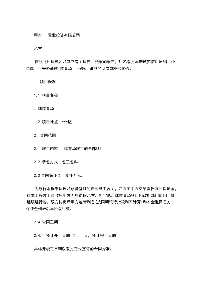 依照《民法典》及其它有关法律、法规的规定,甲乙双方本着诚实信用原则,经自愿、平等协商就 体育场 工程施工事项特订立本框架协议。