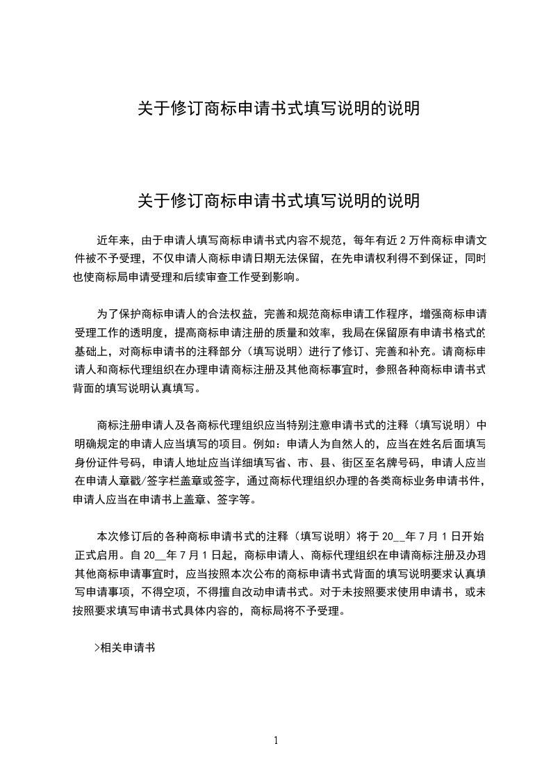 本次修订后的各种商标申请书式的注释(填写说明)将于20__年7月1日开始正式启用。自20__年7月1日起,商标申请人、商标代理组织在申请商标注册及办理其他商标申请事宜时,应当按照本次公布的商标申请书式背面的填写说明要求认真填写申请事项,不得空项,不得擅自改动申请书式。对于未按照要求使用申请书,或未按照要求填写申请书式具体内容的,商标局将不予受理。