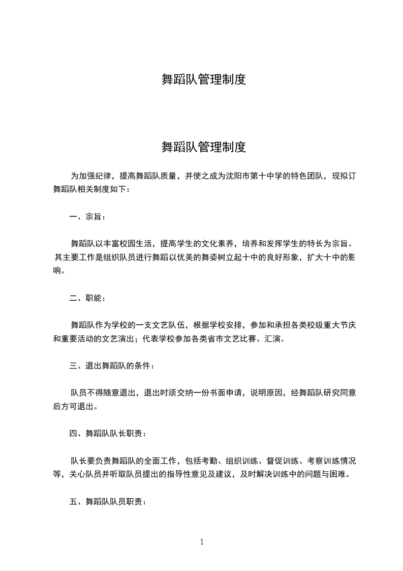 为加强纪律,提高舞蹈队质量,并使之成为沈阳市第十中学的特色团队,现拟订舞蹈队相关制度如下: