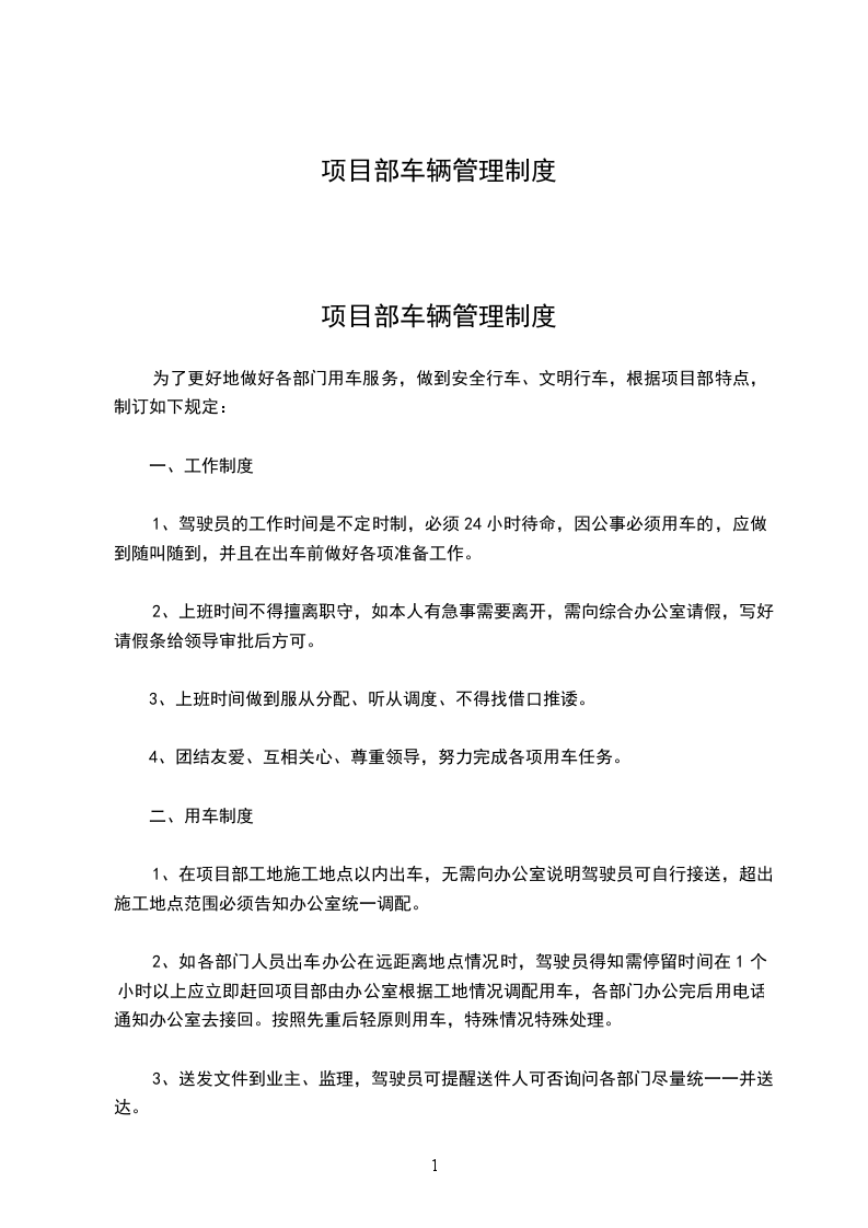 1、在项目部工地施工地点以内出车,无需向办公室说明驾驶员可自行接送,超出施工地点范围必须告知办公室统一调配。