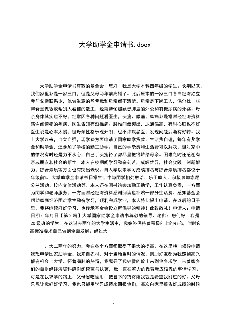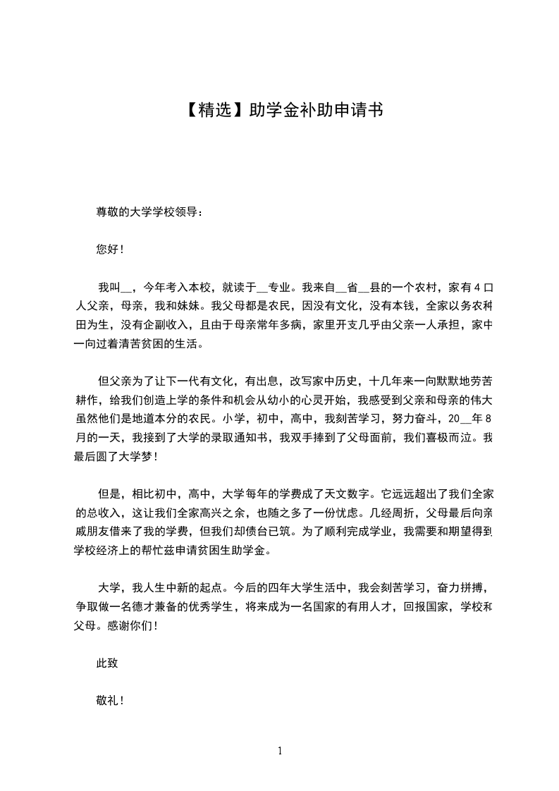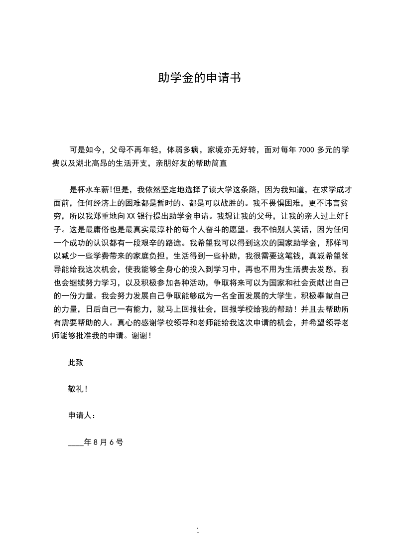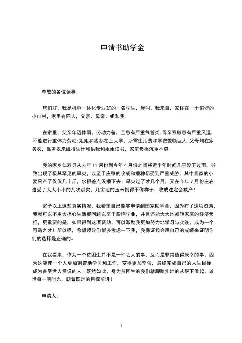 寄予以上这些真实情况,我希望自己能够申请到国家助学金,因为有了这项资助,我就可以不用太担心生活费问题以至于影响学业,并且还能大大地减轻家庭的经济负担,更重要的是,如果得到这项资助,可以激励我更加努力地学习与实践,成为一个可造之才!所以呢,希望领导们能多考虑一下我,我保证我会用自己的成绩来证明你们的选择是正确的。