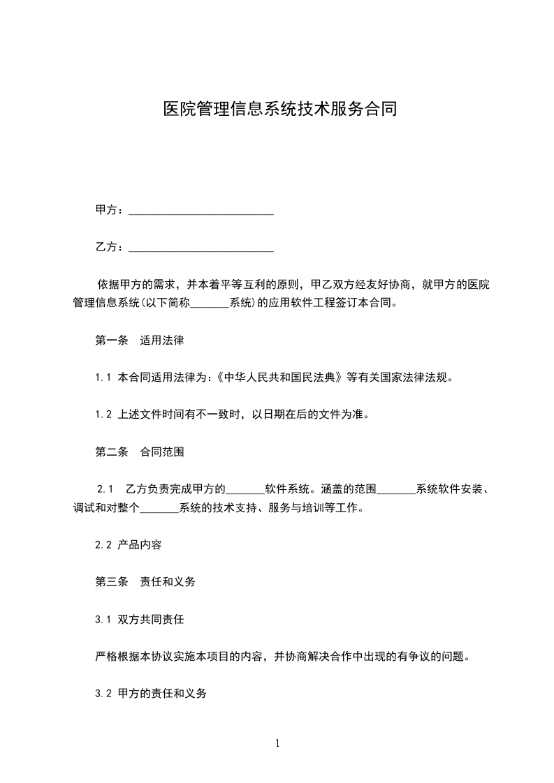 依据甲方的需求,并本着平等互利的原则,甲乙双方经友好协商,就甲方的医院管理信息系统(以下简称_______系统)的应用软件工程签订本合同。