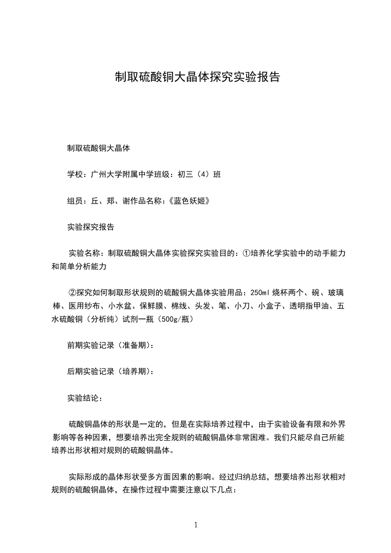 实验名称:制取硫酸铜大晶体实验探究实验目的:①培养化学实验中的动手能力和简单分析能力