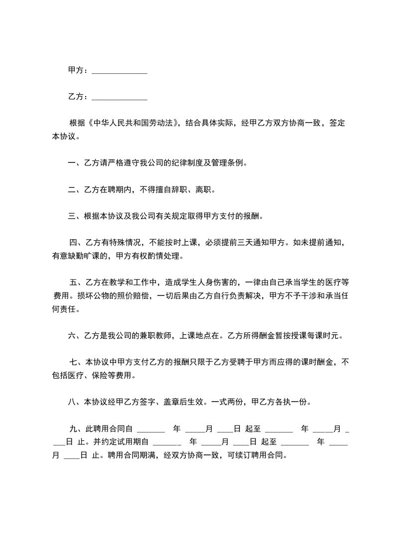 六、乙方是我公司的兼职教师,上课地点在。乙方所得酬金暂按授课每课时元。