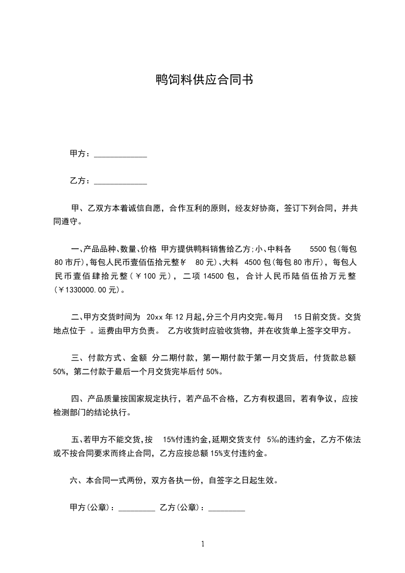 一、产品品种、数量、价格 甲方提供鸭料销售给乙方;小、中料各5500包(每包80市斤),每包人民币壹佰伍拾元整(¥80元)、大料4500包(每包80市斤),每包人民币壹佰肆拾元整(¥100元),二项14500包,合计人民币陆佰伍拾万元整(¥1330000.00元)。