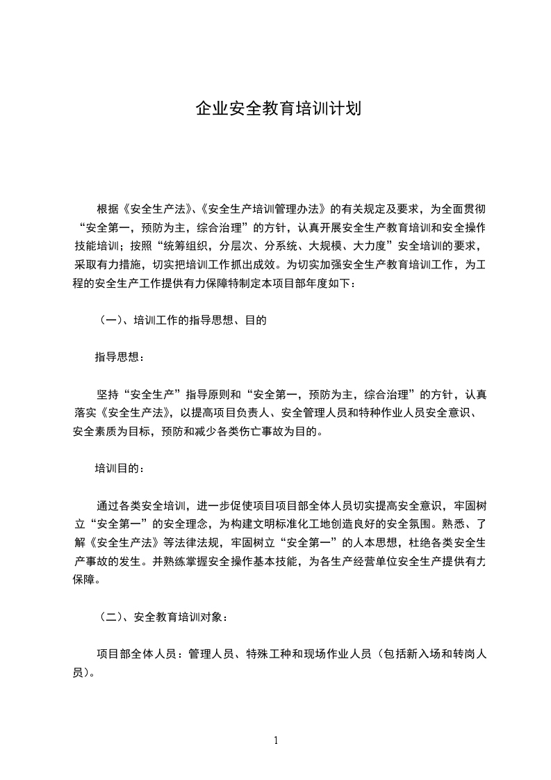 根据《安全生产法》、《安全生产培训管理办法》的有关规定及要求,为全面贯彻“安全第一,预防为主,综合治理”的方针,认真开展安全生产教育培训和安全操作技能培训;按照“统筹组织,分层次、分系统、大规模、大力度”安全培训的要求,采取有力措施,切实把培训工作抓出成效。为切实加强安全生产教育培训工作,为工程的安全生产工作提供有力保障特制定本项目部年度如下: