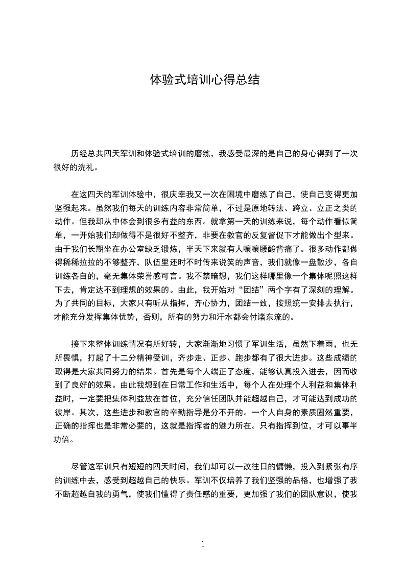 在这四天的军训体验中,很庆幸我又一次在困境中磨练了自己,使自己变得更加坚强起来。虽然我们每天的训练内容非常简单,不过是原地转法、跨立、立正之类的动作。但我却从中体会到很多有益的东西。就拿第一天的训练来说,每个动作看似简单,一开始我们却做得不是很好不整齐,非要在教官的反复督促下才能做出个型来。由于我们长期坐在办公室缺乏锻炼,半天下来就有人嚷嚷腰酸背痛了。很多动作都做得稀稀拉拉的不够整齐,队伍里还时不时传来说笑的声音,我们就像一盘散沙,各自训练各自的,毫无集体荣誉感可言。我不禁暗想,我们这样哪里像一个集体呢照这样下去,肯定达不到理想的效果的。由此,我开始对“团结”两个字有了深刻的理解。为了共同的目标,大家只有听从指挥,齐心协力,团结一致,按照统一安排去执行,才能充分发挥集体优势,否则,所有的努力和汗水都会付诸东流的。