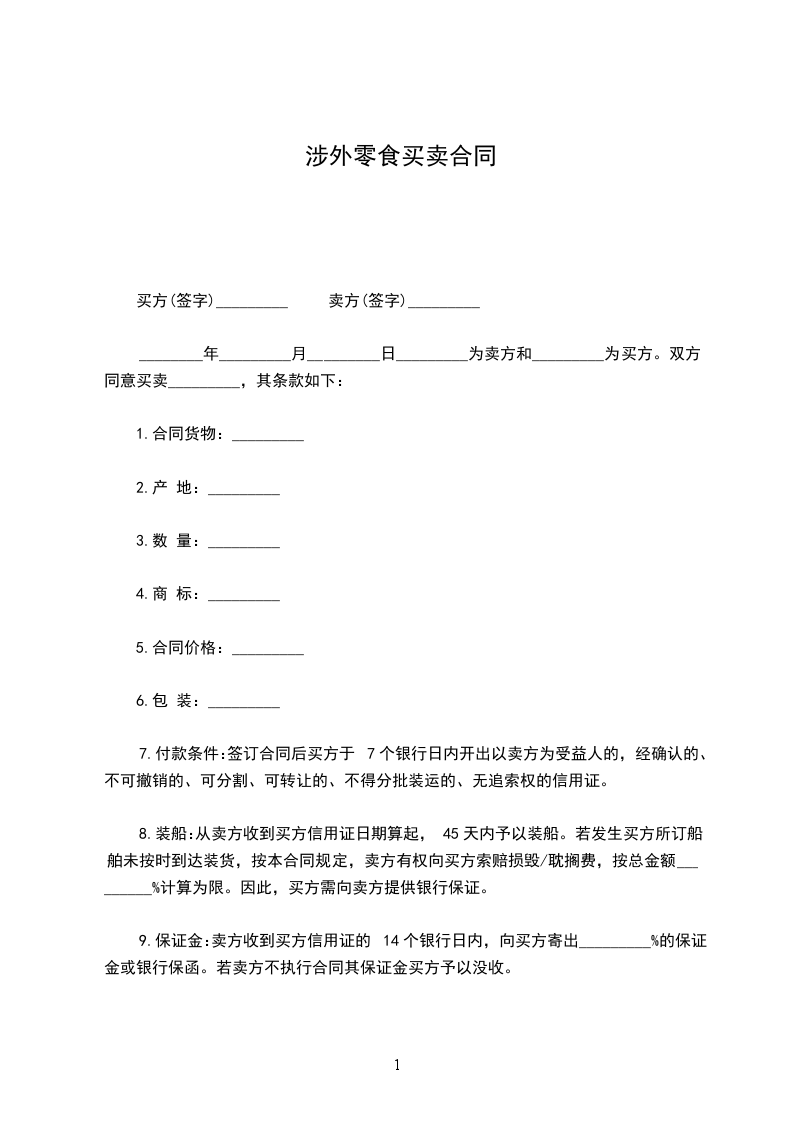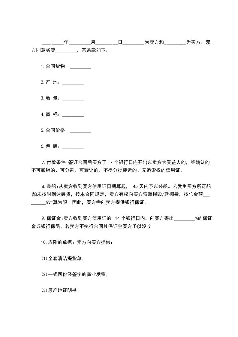 9.保证金:卖方收到买方信用证的14个银行日内,向买方寄出_________%的保证金或银行保函。若卖方不执行合同其保证金买方予以没收。