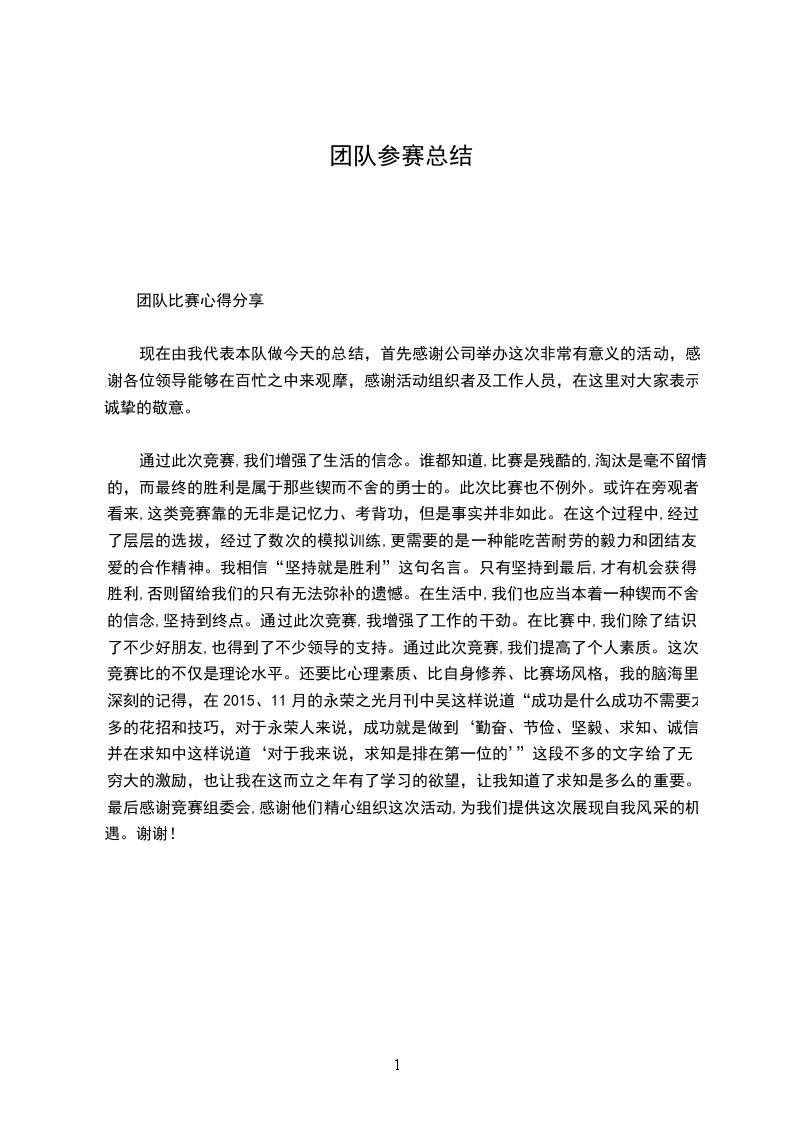 通过此次竞赛,我们增强了生活的信念。谁都知道,比赛是残酷的,淘汰是毫不留情的,而最终的胜利是属于那些锲而不舍的勇士的。此次比赛也不例外。或许在旁观者看来,这类竞赛靠的无非是记忆力、考背功,但是事实并非如此。在这个过程中,经过了层层的选拔,经过了数次的模拟训练,更需要的是一种能吃苦耐劳的毅力和团结友爱的合作精神。我相信“坚持就是胜利”这句名言。只有坚持到最后,才有机会获得胜利,否则留给我们的只有无法弥补的遗憾。在生活中,我们也应当本着一种锲而不舍的信念,坚持到终点。通过此次竞赛,我增强了工作的干劲。在比赛中,我们除了结识了不少好朋友,也得到了不少领导的支持。通过此次竞赛,我们提高了个人素质。这次竞赛比的不仅是理论水平。还要比心理素质、比自身修养、比赛场风格,我的脑海里深刻的记得,在2024、11月的永荣之光月刊中吴这样说道“成功是什么成功不需要太多的花招和技巧,对于永荣人来说,成功就是做到‘勤奋、节俭、坚毅、求知、诚信’并在求知中这样说道‘对于我来说,求知是排在第一位的’”这段不多的文字给了无穷大的激励,也让我在这而立之年有了学习的欲望,让我知道了求知是多么的重要。最后感谢竞赛组委会,感谢他们精心组织这次活动,为我们提供这次展现自我风采的机遇。谢谢!